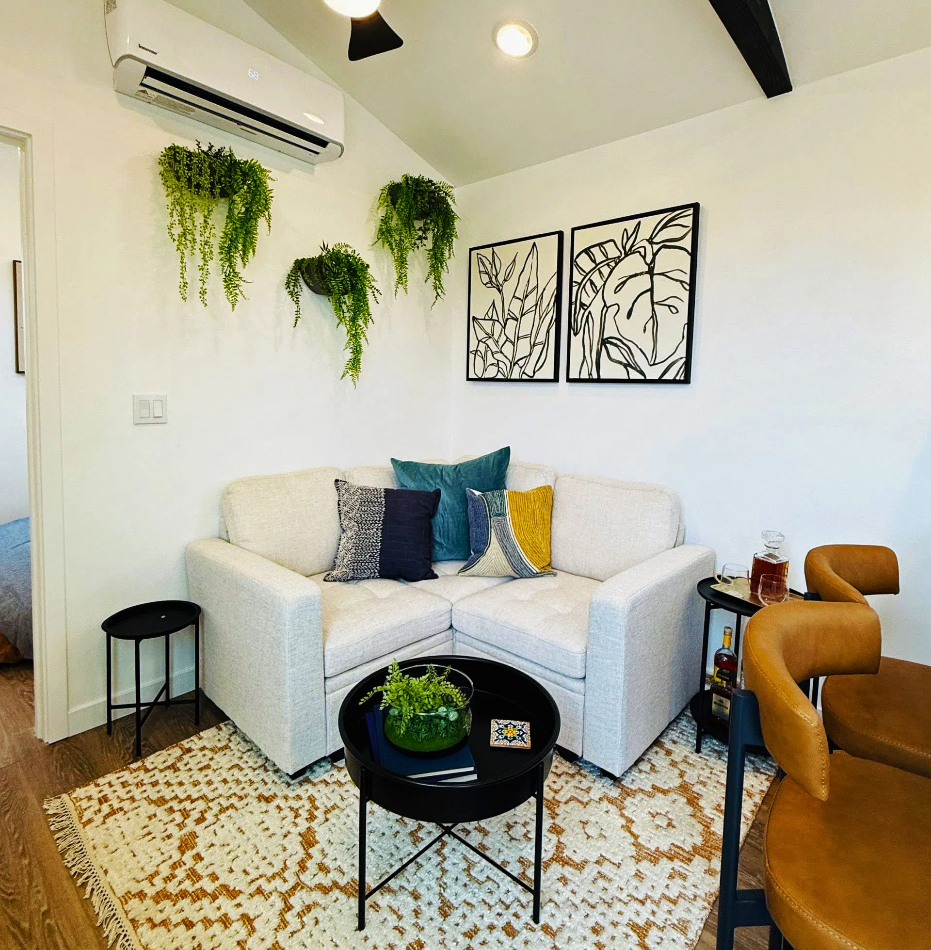 Ruang tamu Tiny Tandem menampilkan sofa sudut yang cute dengan laci penyimpanan terintegrasi—sempurna untuk menyimpan linen, buku, atau bahkan pakaian. Ada juga bar cart yang sleek, meja kopi kecil, dan ruang dinding untuk karya seni, rak terbuka, atau bahkan smart TV berukuran besar.